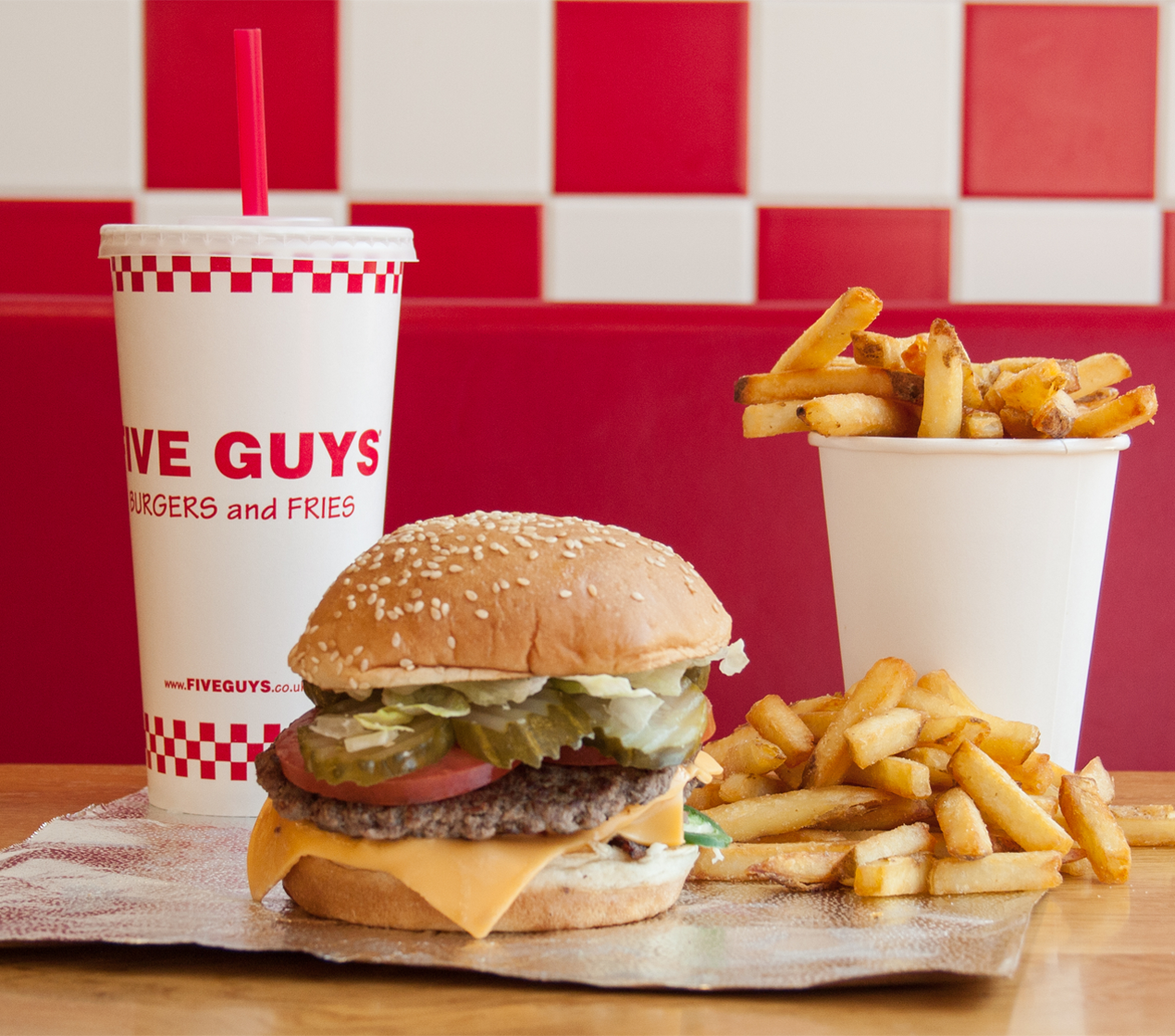 Five Guys, c’est aussi des frites fraîches coupées chaque jour et cuites à la perfection, des hot dogs, des Milkshakes et une sélection de 120 boissons, le tout dans une ambiance rock, décontractée et sans chichi.