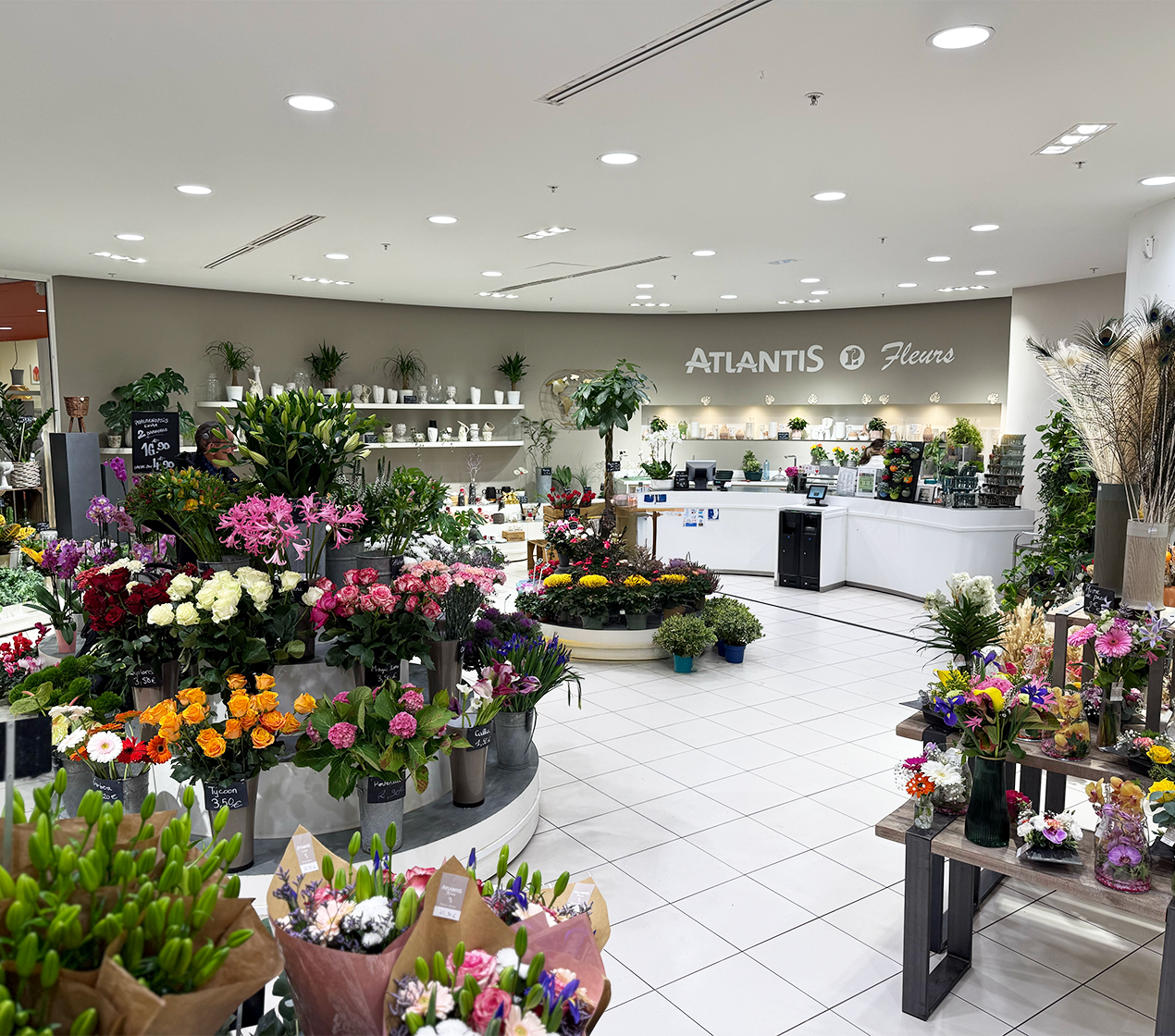 La boutique ATLANTIS FLEURS se situe au bout de la ligne de caisse , face à Mac Dupont.